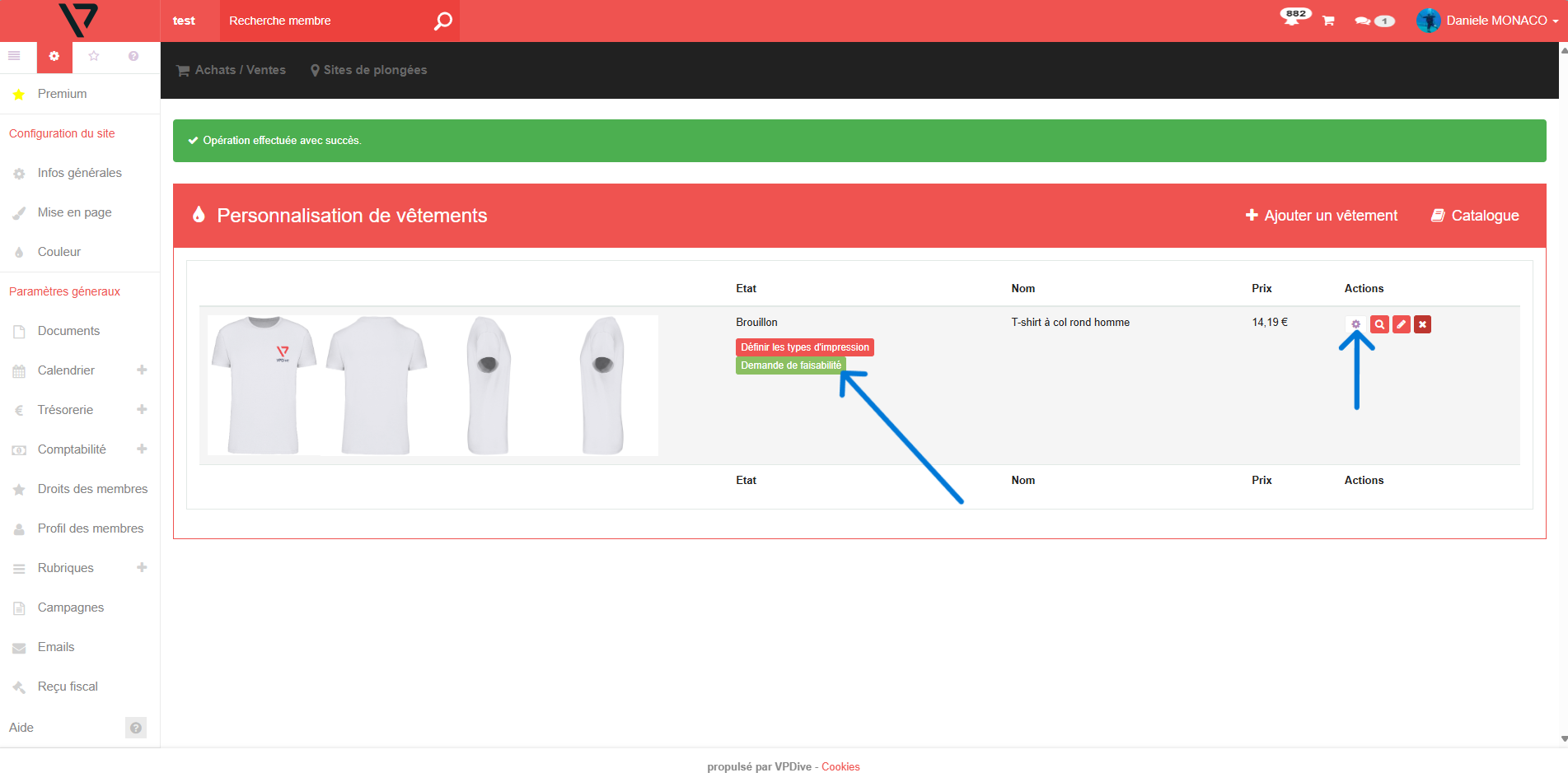 Rendez-vous sur votre espace VPDive et cliquez sur l’icône de la roue crantée, puis sur Print > Produit. Avant de commencer, vous pouvez consulter le catalogue des vêtements disponibles. Même si toutes les références ne sont pas encore en ligne, elles seront ajoutées progressivement selon vos demandes.